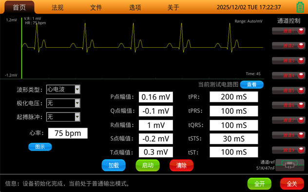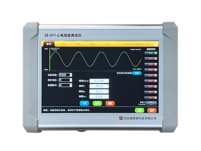 SE-971心电性能测试仪是一款专用于心电相关医疗器械型式检验的测试设备。它不仅可提供低至1μV的心电测试信号,同时还提供心电检测标准测试电路,能完成包括共模抑制比测试在内的所有心电电性能测试。整机采用全铝合金的屏蔽机箱,保证了超强的抗电磁干扰设计性能。同时超低的输出信号噪声保证了微伏级的低压信号波形也能高保真呈现。仪器自带自定义波形输出功能,可还原真实心电采集信号,为各种AI算法训练提供测试模拟信号。它还提供10.1英寸液晶触摸屏,可以使用户方便地操作众多功能,得心应手地编辑各种常用波形。